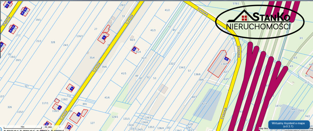 powierzchnia około 6400 m2, szerokość 32 m - głębokość 200 m, położenie - przy drodze asfaltowej - IRYSOWA. Działka jest płaska. Teren na którym znajduje się nieruchomość objęty jest MPZP (symbolika terenu w planie - 16USM/MN ). Jest to teren o przeznaczeniu do zabudowy usługowej, składów, magazynów oraz tereny zabudowy mieszkaniowej jednorodzinnej